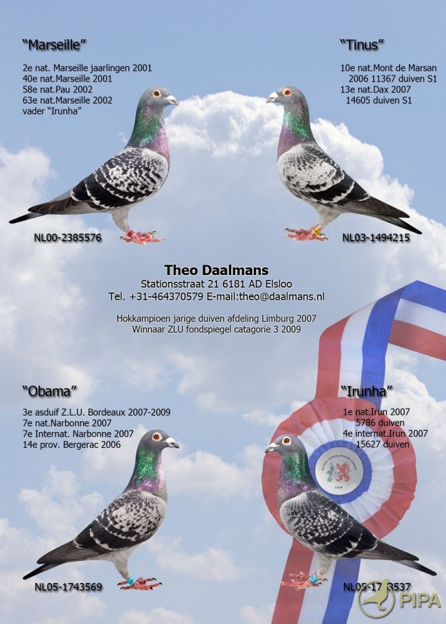 Na zijn glansrijke carrière werd alleskunner ‘Marseille’ naar het kweekhok verplaatst, een traditie die Theo sindsdien hoog in het vaandel heeft. Hij kweekte direct ‘Irunha’, die na zijn 1. Nat. Irun 2007 ook zijn genen mag doorgeven … daarin wordt hij vergezeld door top doffer ‘Skip’, onlangs gekroond tot 3. Nationale en 10. Internationale asduif Marseille 2008-2009-2010. Dit supertrio voert de glansrijke kweekkolonie met verve aan; nieuw succes ligt daarmee vlot op de loer!